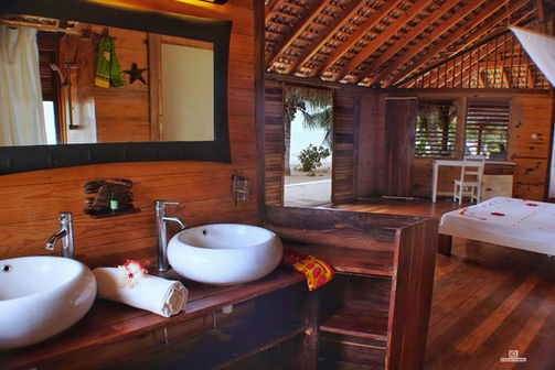Chaque bungalow d’une surface de 77m2 avec sa varangue extérieure, est équipé d’un lit double avec moustiquaire, d’un salon faisant office de chambre annexe pour les familles avec enfants, d’un coin salle de bain avec douche, double vasque et WC privatif……coffre-fort, frigo, climatisation, repose valise double et penderie. Les bungalows, tous identiques, sont aménagés à façon pour une personne seule, un couple et une famille jusqu’à trois enfants ou adolescents.